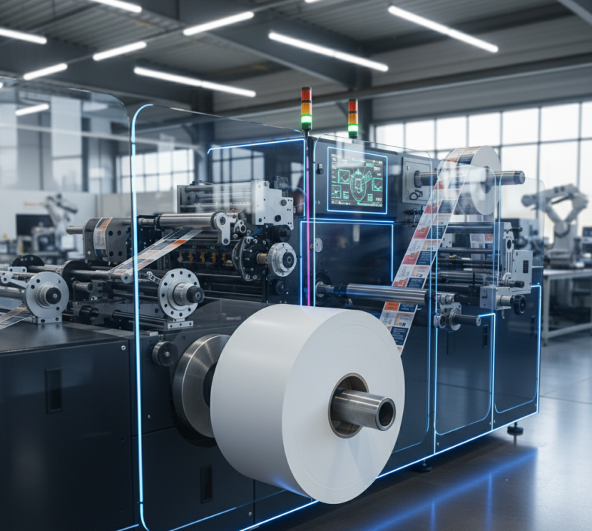 - Stanzung: Perforation (im Etikett selbst oder zwischen den Etiketten), Längsschlitzung, Sensorauslochung, Sicherheitsstanzung